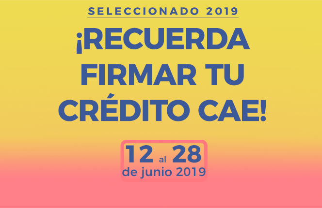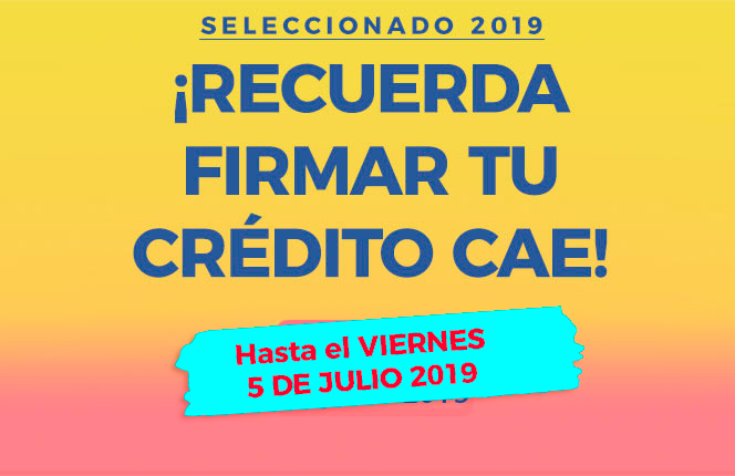 Hasta el VIERNES 28 DE JUNIO 2019 tienen plazo, los estudiantes que este año lograron el Crédito con Garantía Estatal, para firmar la documentación legal de su Crédito CAE. Al hacerlo, estarán aceptando formalmente que el financiamiento que solicitaron para pagar sus carreras, sea transferido a sus respectivas instituciones de educación superior.