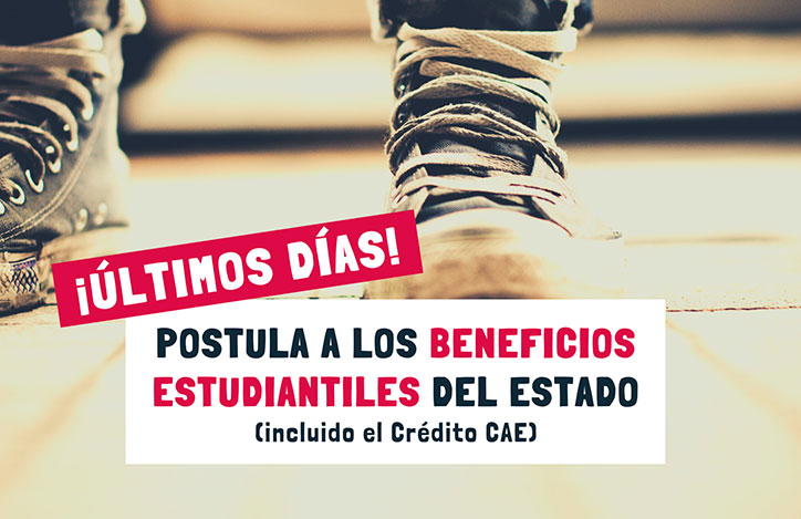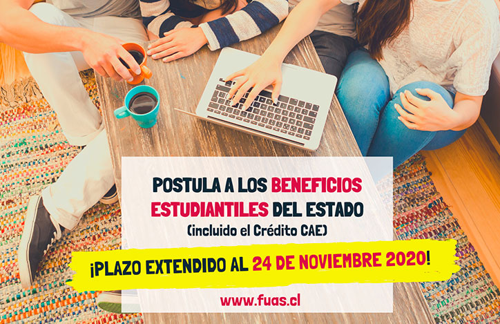 Hasta el MARTES 24 DE NOVIEMBRE 2020, a las 14:00 horas, fue ampliado el plazo para solicitar la gratuidad; becas de arancel y créditos del Estado, incluido el Crédito con Garantía Estatal (CAE). Si requieres financiamiento para iniciar o continuar una carrera técnica o profesional a partir del año 2021, completa el formulario que encontrarás en www.fuas.cl.