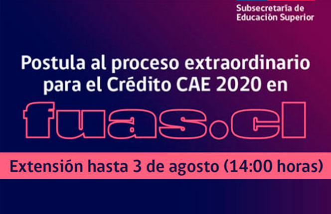 A través de fuas.cl, pueden solicitar el Crédito con Garantía Estatal (CAE), para el segundo semestre del año, los estudiantes de Primer Año y de Cursos Superiores de instituciones de Educación Superior acreditadas y participantes del Sistema CAE, que no hayan postulado anteriormente a los beneficios estudiantiles para este año 2020 (es decir que no hayan completado y enviado el formulario FUAS en octubre/noviembre 2019 o bien, en marzo /abril 2020).