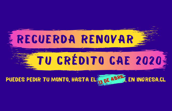Si necesitas renovar el Crédito con Garantía Estatal (Crédito CAE) para financiar tus estudios superiores, y no alcanzaste a pedir el monto en el período regular, podrás hacerlo entre el 25 de mayo y el 21 de agosto 2020, en “Mi Crédito CAE” de www.ingresa.cl