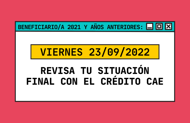Comisión Ingresa publicará, el VIERNES 23 DE SEPTIEMBRE 2022, el estado definitivo que tendrán este año 2022, los beneficiarios/as que obtuvieron el Crédito con Garantía Estatal (Crédito CAE) en años anteriores. Es importante que revises ese mensaje, digitando tu RUT en https://resultadorenovacioncae.ingresa.cl/, si has egresado de tu carrera, congelaste estudios o dejaste la educación superior, o bien, si pediste el monto del Crédito CAE en el plazo extraordinario (hasta el 16 de septiembre 2022); o si estás resolviendo alguna situación que te ha impedido renovar el financiamiento este año.
