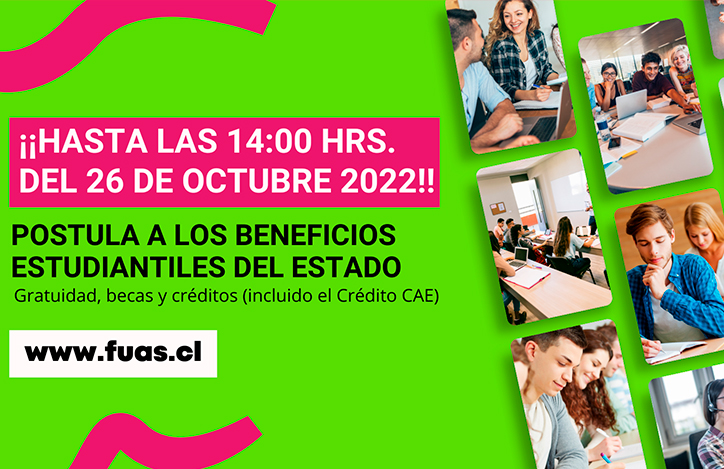 ¿Necesitas financiamiento para iniciar o continuar una carrera? Acuérdate que tienes plazo HASTA LAS 14:00 HORAS DEL MIÉRCOLES 26 DE OCTUBRE 2022 para solicitar, en www.fuas.cl, la gratuidad; becas de arancel; el Fondo Solidario de Crédito Universitario y el Crédito con Garantía Estatal (Crédito CAE). Los resultados de preselección se publicarán en enero 2023.