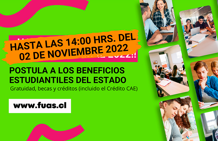 Hasta las 14:00 HORAS DEL MIÉRCOLES 02 DE NOVIEMBRE 2022, en www.fuas.cl, podrás solicitar la gratuidad; becas y créditos del Estado (incluido el Crédito CAE), si necesitas financiamiento para iniciar o continuar una carrera. Los resultados de la postulación se publicarán en enero 2023. El Sistema de Financiamiento te asignará la/s ayuda/s que corresponda/n, según los requisitos académicos y socioeconómicos que cumplas.
