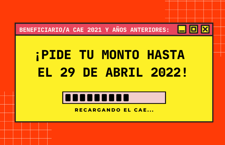 Solicita tu monto en “Mi Crédito CAE” de www.ingresa.cl, si estudias con apoyo del Crédito con Garantía Estatal (Crédito CAE), desde 2021 o años anteriores, y necesitas el financiamiento para continuar tu carrera. Los resultados de la renovación se publicarán el 20 de mayo 2022. Tu petición será acogida, siempre que te matricules con derecho al CAE, en los plazos establecidos por tu institución.
