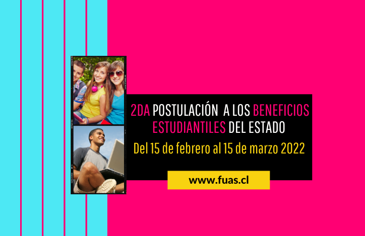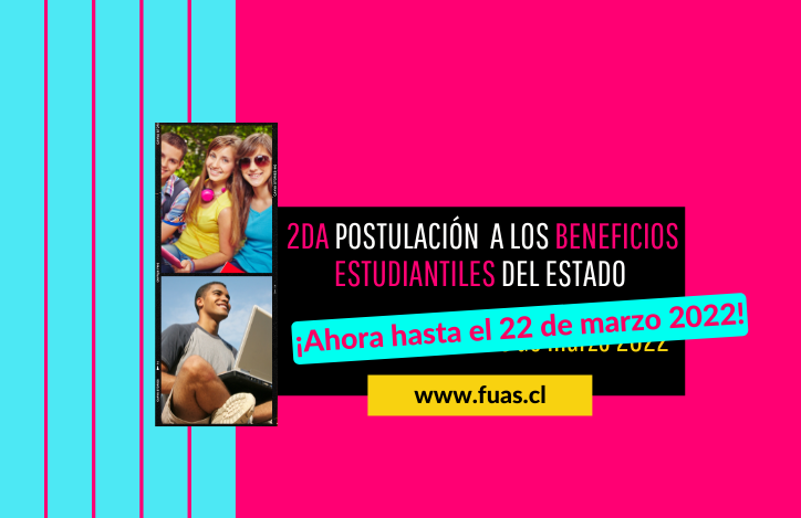 Solicita los Beneficios Estudiantiles del Estado (incluido el Crédito CAE), si necesitas financiamiento para iniciar o continuar una carrera este año, y NO postulaste a las ayudas en octubre/noviembre 2021. Para acceder a los beneficios, deberás completar y enviar el Formulario Único de Acreditación Socioeconómica (FUAS), que estará disponible desde el 15 de febrero al 15 de marzo 2022, en www.fuas.cl