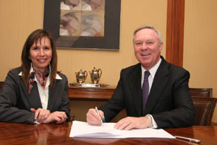 James Callahan, Gerente General y Country Head de Scotiabank, y Alejandra Contreras, Directora Ejecutiva de Comisión Ingresa, administradora del Sistema de Crédito para Estudios Superiores, firmaron el jueves 6 de agosto, el acuerdo de participación del banco en la administración y financiamiento de los créditos asignados en este 2009.