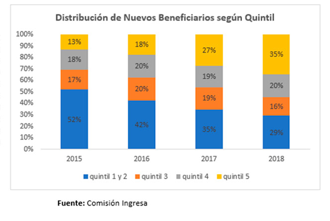 Prueba de ello es que en 2018, por primera vez en los 13 años de asignación del Crédito CAE, el quintil 5, que representa a las familias de mayores ingresos, fue el que tuvo mayor número de nuevos beneficiarios CAE: 22 mil 100 estudiantes (35% del total)