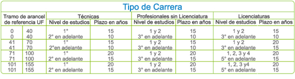 – Egresados: el crédito considera 240 cuotas (20 años) escalonadas en tres tramos.