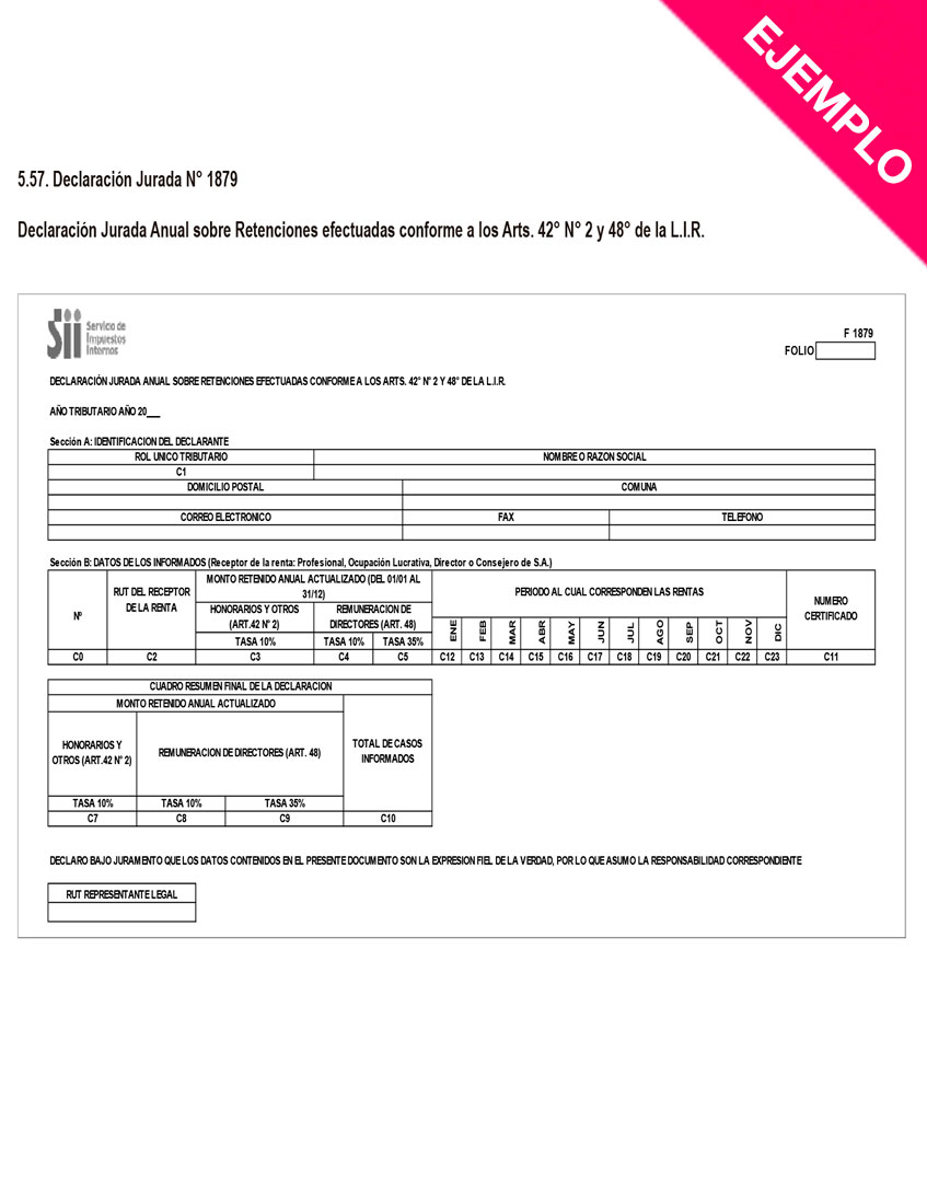 ¡IMPORTANTE! La Declaración Jurada N°1879 contiene la información de los ingresos percibidos en un año tributario determinado (enero-diciembre). Por lo tanto, si tu postulación exige acreditar las rentas percibidas con posterioridad a ese período, no olvides adjuntar adicionalmente el “Certificado N° 2 sobre Honorarios y Participaciones o Asignaciones a Directores Pagados por Sociedades Anónimas” o el “Certificado N°1 sobre Honorarios”, según sea el caso de modo, de modo de incluir la totalidad de los meses requeridos en el formulario de postulación al beneficio. |
