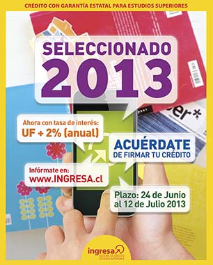 02-05-2013¡Es el último paso! Si has sido seleccionado este año con el Crédito con Garantía Estatal, recuerda que ENTRE EL 24 DE JUNIO Y EL 12 DE JULIO 2013, te corresponde firmar la documentación legal del beneficio, en el banco que te fue asignado. Digita tu RUT en www.ingresa.cl, busca tu banco y anda a firmar tu contrato en el plazo señalado. No olvides llevar tu cédula de identidad vigente, fotocopia de la misma por ambos lados, y copia impresa y firmada de tu mensaje de alumno seleccionado, disponible enwww.ingresa.cl
